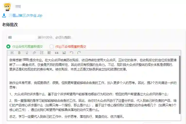 每一次作业提交后,导师都会做点评,且都非常的细致,可以说是课程之外的加餐,相当于1V1的指导,要知道老师单独指导的市场价可是学费的好几倍!
