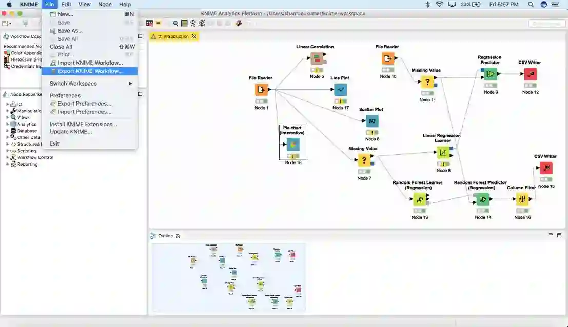 为了导出一个KNIME工作流,可以简单地单击File > Export KNIME Workflow。