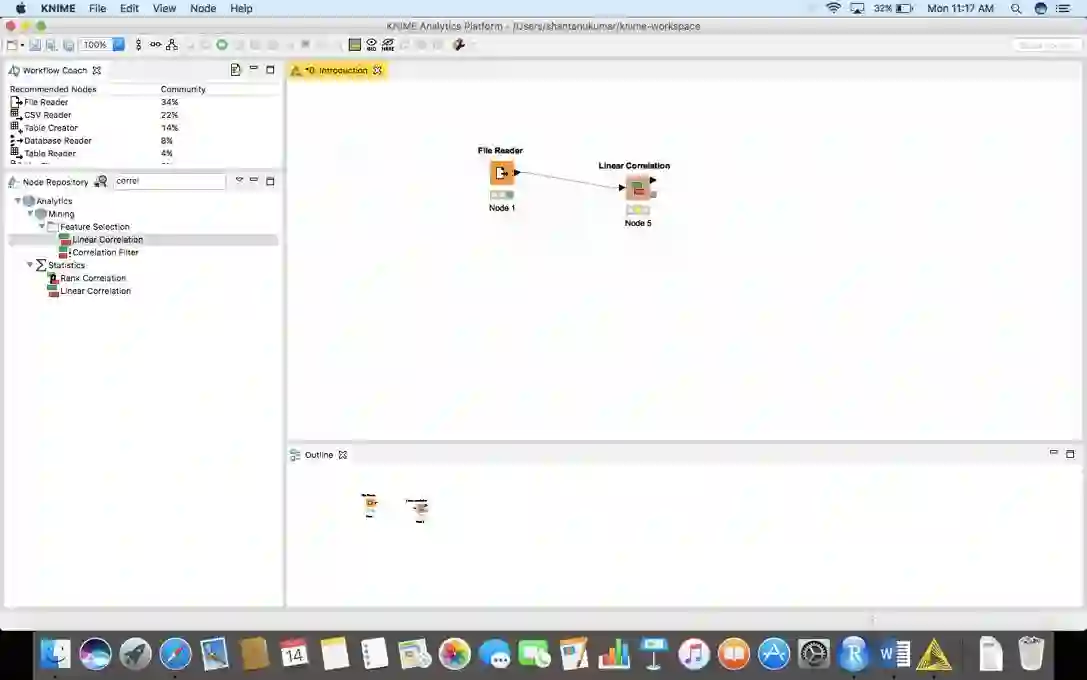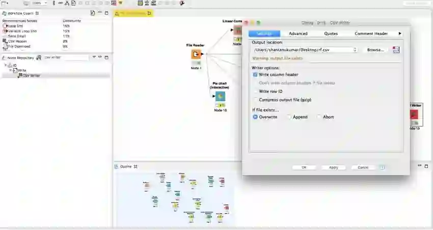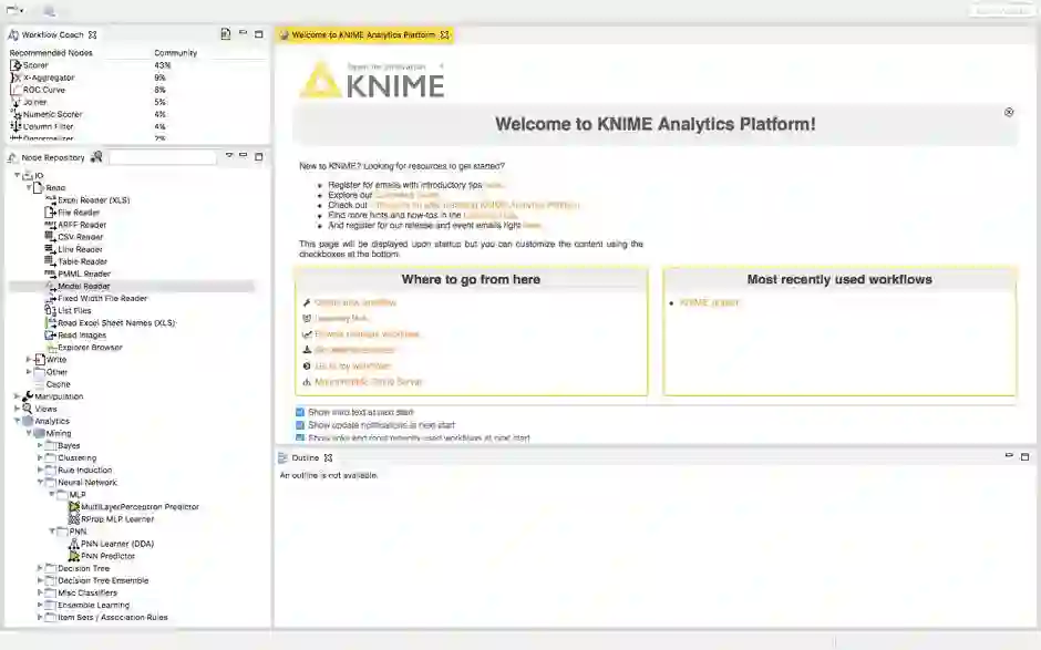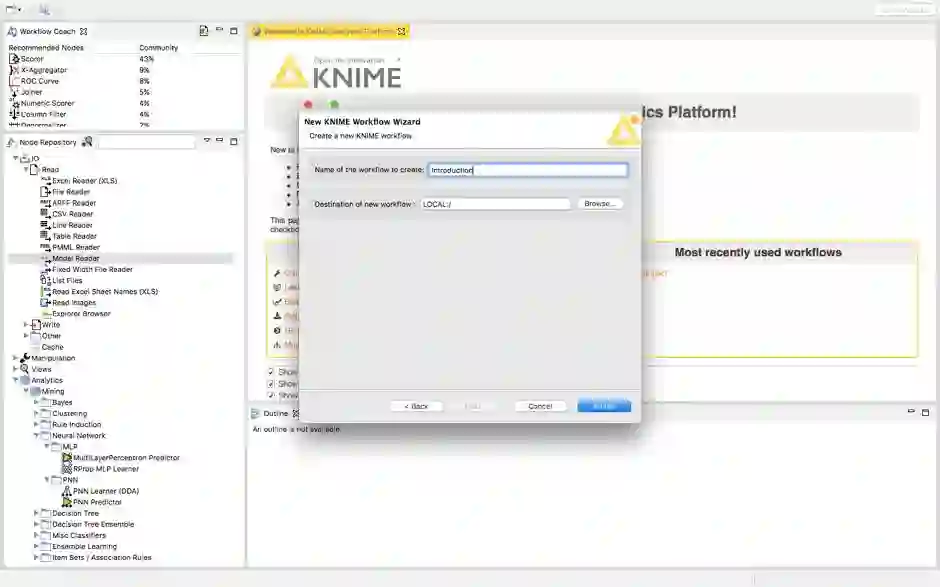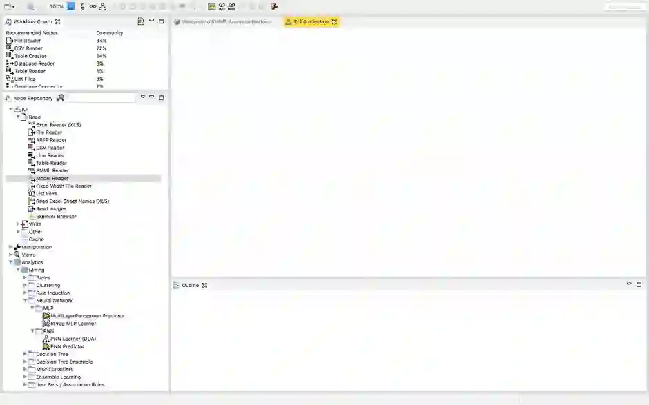在左上角的工作流指导会向你展示KNIME社区特定节点的使用百分比。节点存储库将显示特定工作流可以拥有的所有节点,这取决于你的需要。当创建第一个工作流时,你还可以浏览示例工作流来检查更多的工作流。这是迈向解决任何问题的第一步。