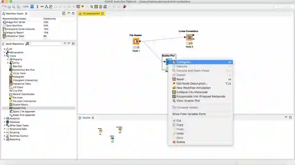 在我们的节点存储库中搜索Views 项下的Scatter Plot 。将其以类似的方式拖放到工作流中,并将文件阅读器的输出连接到此节点。