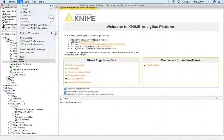 安装该平台,并为KNIME设置工作目录以存储其文件: