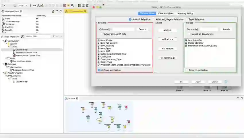在节点存储库中找到节点列过滤器Column filter,并将其拖到工作流中。将预测器的输出连接到列筛选器,并配置它筛选所需的列。在这种情况下,你需要Item_Identifier、Outlet_Identifier和Outlet_Sales的预测。