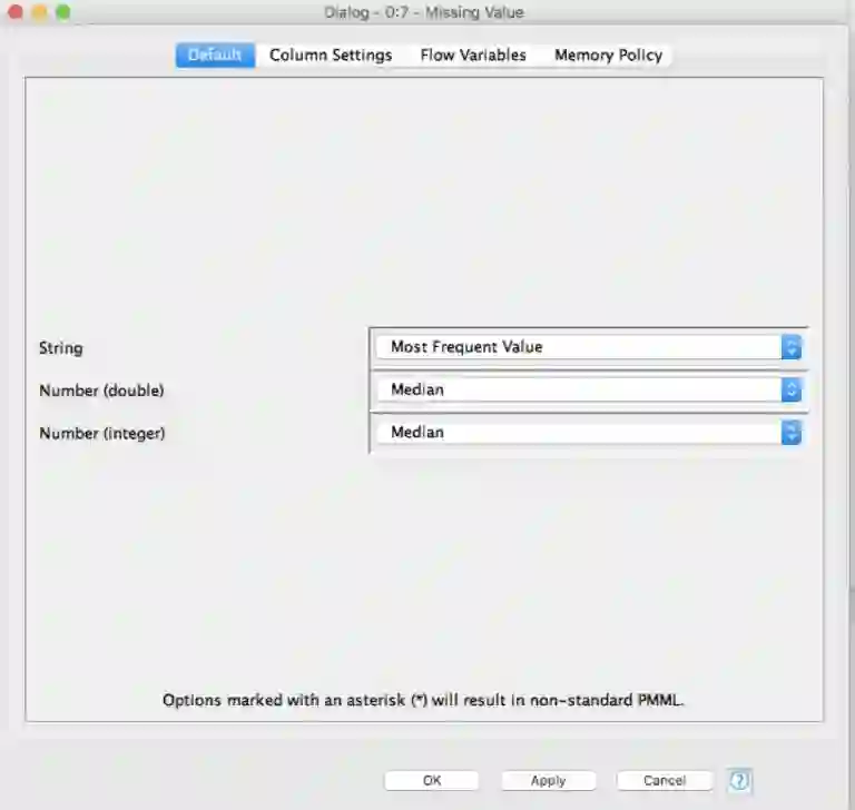 现在,当我们执行它时,在Missing value节点的输出端口上已经准备好了具有imputed values的完整数据集。在我的分析中,我选择了imputation 方法为: