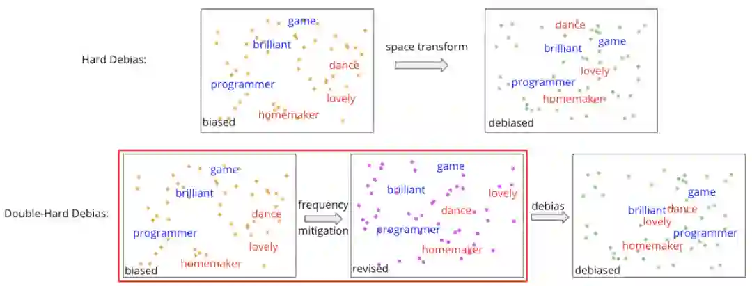 先前的工作[1]通过后处理(post-processing)从词嵌入中减去与性别相关的成分,从而减少了性别偏见。具体而言,它需要一组特定于性别的单词对,并计算这些单词对的差异向量的第一个主成分作为嵌入空间中的性别方向。其次,它将有偏见的词嵌入投射到与推断的性别方向正交的子空间中,以消除性别偏见。虽然证明了这种方法可以缓解单词类比任务中的性别偏见,但这篇论文(Lipstick on a Pig: Debiasing Methods Cover up Systematic Gender Biases in Word Embeddings But do not Remove Them[2])认为这些努力的效果是有限的,因为性别偏见仍然可以从去偏后的嵌入几何图中恢复。
