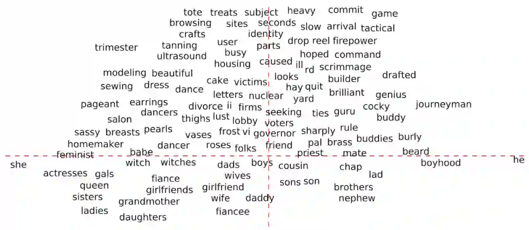 轴是在嵌入过程中捕获性别中立性的方向,与性别无关的位于上半部分,而与性别有关的词位于下半部分。尽管从定义上说,brilliant和genius不分性别,但它们的embedding更加接近男性(he)。同样,homemaker和sewing与女性(her)联系更紧密。