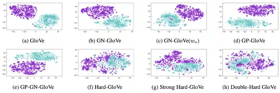 我们还对所有前500个有偏见的女性和男性嵌入进行tSNE预测。如下图所示,原始的GloVe嵌入明显投影到了不同的区域,表明强烈的性别偏见。与其他方法相比,Double-Hard GloVe最大程度地混合了男性和女性的嵌入,显示出在消除偏见后可以捕获到较少的性别信息。