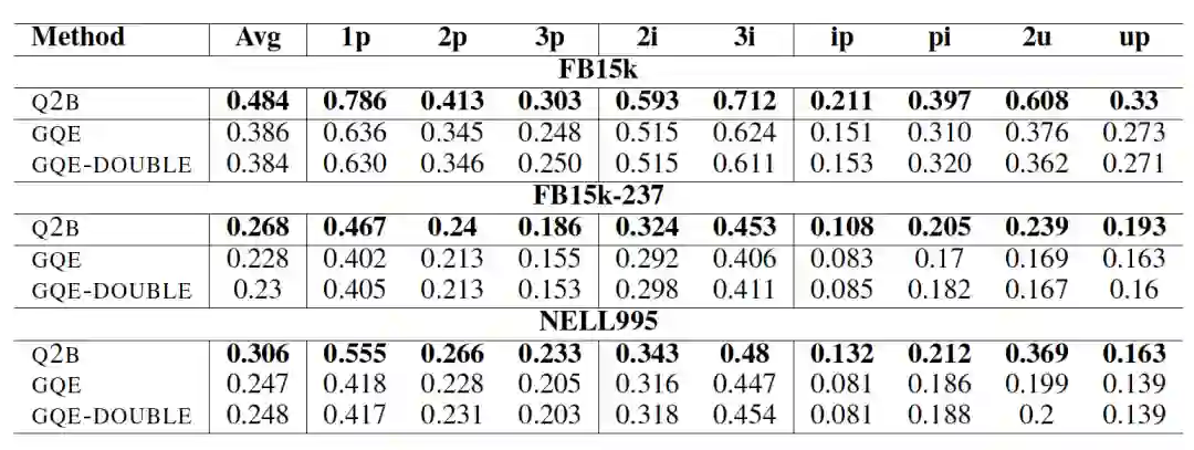 模型系统地在三个标准的知识图谱(FB15K,FB15K-237,NELL995)进行了评测,并与另一个相关的 baseline GQE (Hamilton et al., 2018)进行了对比:
