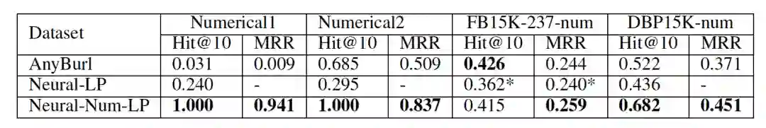 模型系统地在两个标准的知识图谱(FB15K-237-num, DBP15K-num)上进行了评测,并且为了体现出数值推理的作用,文中又构造了俩个富含属性信息的数据集 Numerical-1/2,实验结果如下: