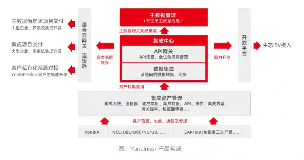 而自从 2000 年初,用友就陆续发版了门户 /ESB/IDM/MDM 等集成中间件,在当前阶段,用友面向混合云集成需求及集成中间件的经验,在用友 BIP 内植入 YonLinker 集成网关,提供面向接口协议的技术连接器,和开箱即用的业务连接器,全方位打通了云上云下用户、基础档案、认证等能力。