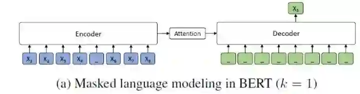。k = v - u + 1 表示 mask 的窗口大小 , 表示一句话中多少个 token 被 mask 。对于 MASS 的语言模型来说, 其输入为 mask 后的序列