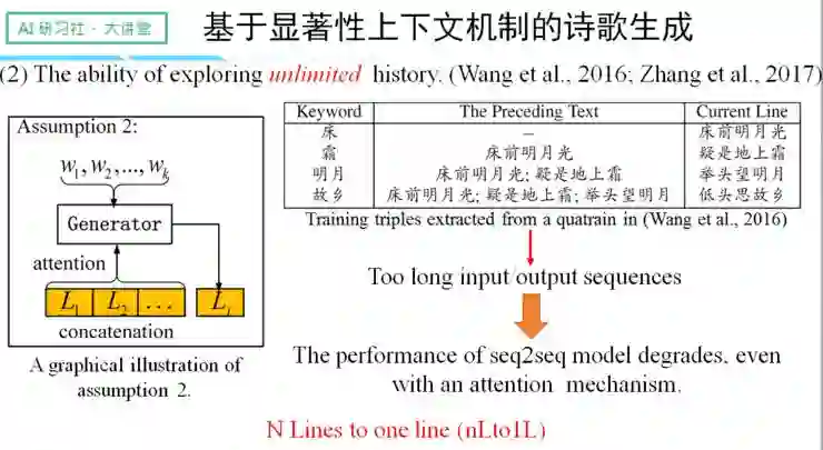 这种假设的好处是可以有区分性地选择历史信息,忽略虚词。然而随之而来的问题是,当诗词的句子数过多时,比如以某宋词的第十五句作为例子,那么就需要将前面的十四句先拼成很长的序列作为输入,这将导致性能的大幅下降。