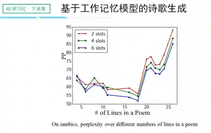 一首诗歌的句子数目越多,整体的 perplexity 就越大,因为句子数目越多,上下文的关联性越难被确认,导致不确定性越大。同时我们还发现,History Memory 的槽数越多,perplexity 就越小,不确定性也随着变小。