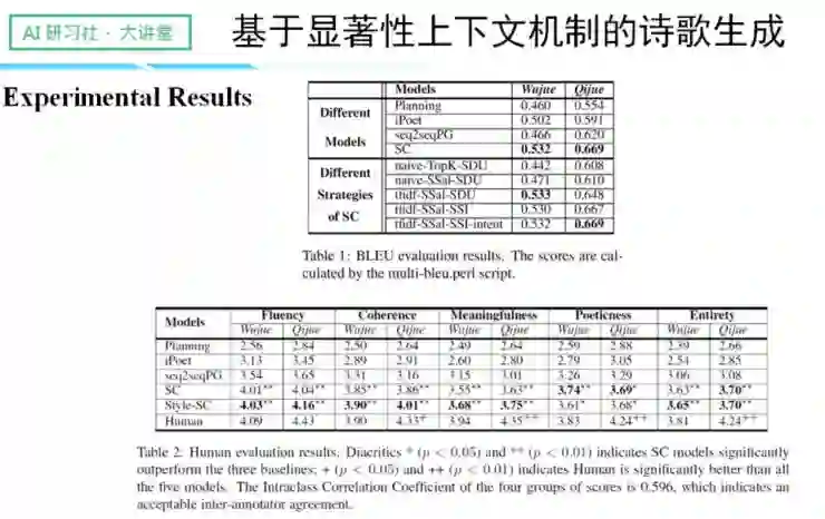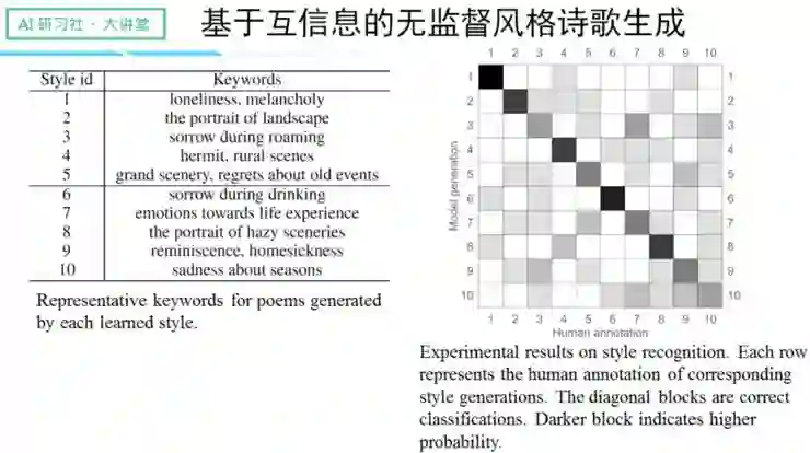 右边是人类评测的结果,对角线越明显,说明风格的识别率越高。一下生成十种风格的诗歌,还能取得这么高的识别率,说明实验的结果非常好。