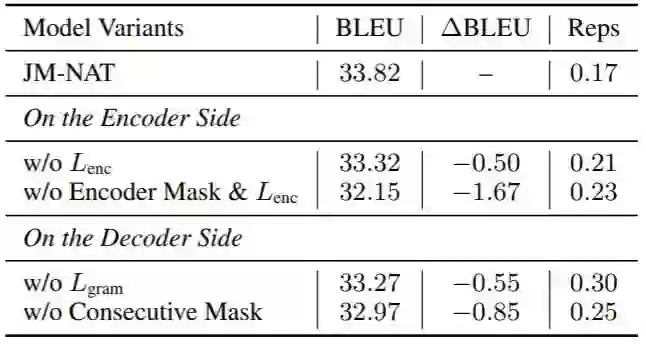 本文提出在序列到序列的非自回归模型上进行掩码训练,在编码端和解码端联合训练,进而更加全面地增强非自回归模型的效果。更加重要的是,这种方法为简洁、有效的非自回归模型预训练方法提供了思路。
