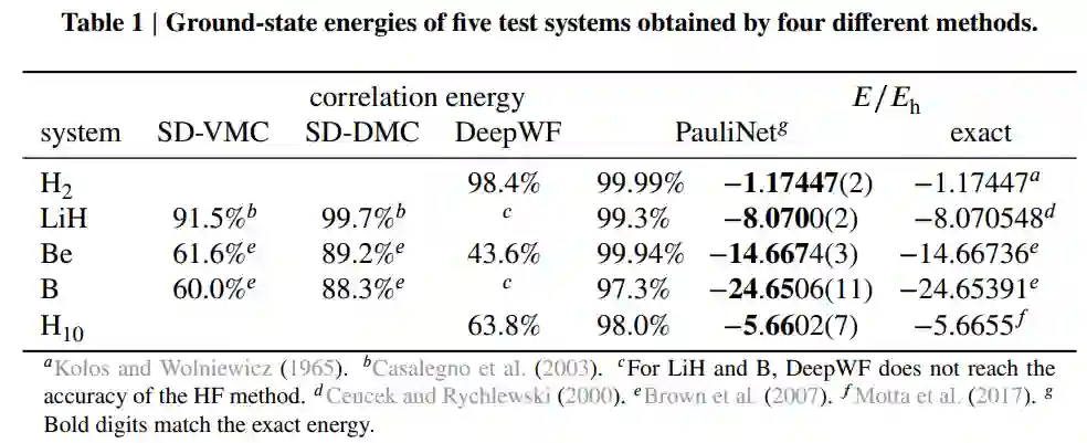 结果表明,PauliNet 的性能优于这三种用于原子、双原子分子和强相关氢链的 SOTA VMC 拟设方法,并且具有较高的计算效率。下表 1 为使用这四种不同方法时,H_2、LiH、Be、B 和 H_10 五种系统的基态能量对比: