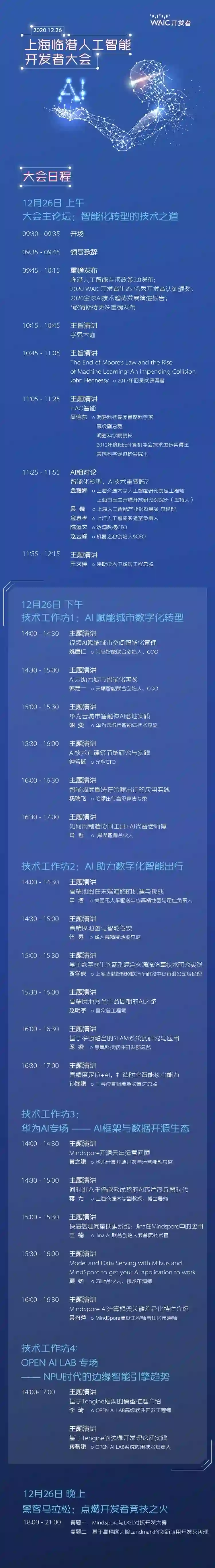 全球顶尖AI专家齐聚主论坛,解读智能化转型的技术之道。4场技术工作坊分享智慧城市、智能出行、华为开源生态与边缘智能引擎等话题,2场黑客松等你来战。