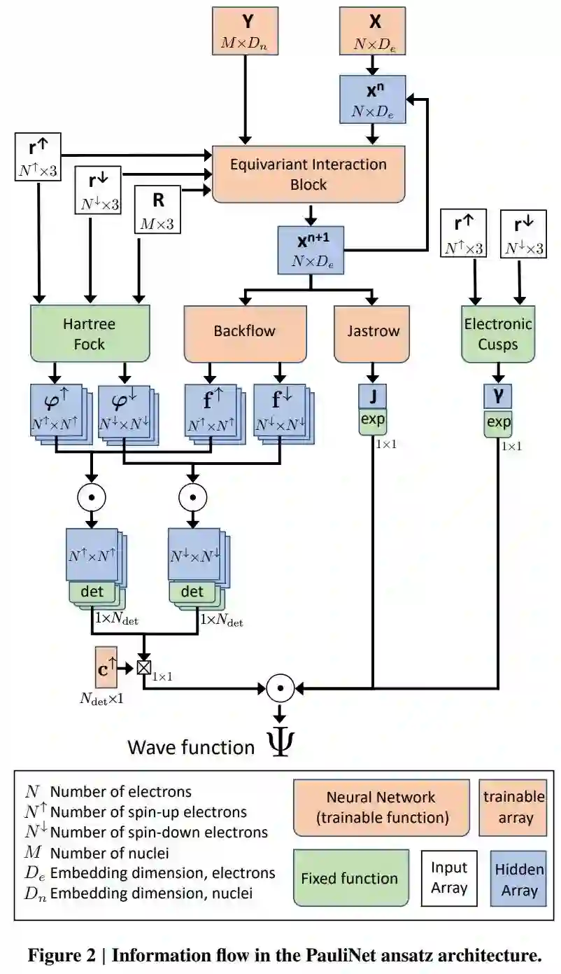 受到「泡利不相容原理」(Pauli exclusion principle)的启发,研究者将他们的方法命名为「PauliNet」。它是一种深度学习波函数拟设,可以获得电子薛定谔方程的近乎精确解。PauliNet 具有一个作为基线的内置多参考哈特里-福克(Hartree–Fock)解,集成有效波函数的物理特性,并使用变分量子蒙特卡罗方法(variational quantum Monte Carlo, VMC)进行训练。