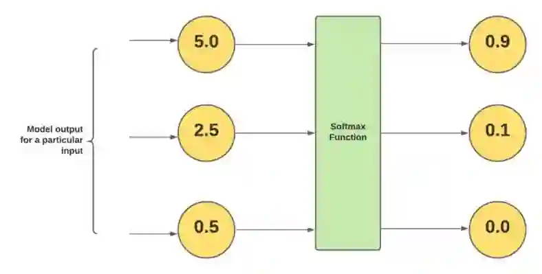 在对每个类应用上述数学函数后,Softmax 会为每个类计算一个介于 0 和 1 之间的值。