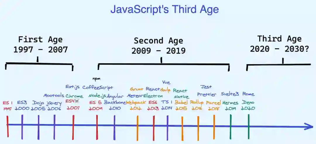 JS 的第二纪元(从 2009 至 2019) 是从关键的 2009 年开始的,这一年诞生了 npm,Node.js 和 ES5。随着 Doug Crockford 在 《JavaScript 精粹》 一书中向我们展示了 JS 的精妙之后,JS 的使用者们创造出了一大堆的 JS 构建工具 和库,并将 JS 的应用范围扩展到了台式机和新型智能手机。到了 2019 年,我们甚至看见,在手机端出现了诸如 Facebook 的 Hermes 之类的定制 JS 运行时系统,以及诸如 Svelte 3 之类的预编译前端框架。