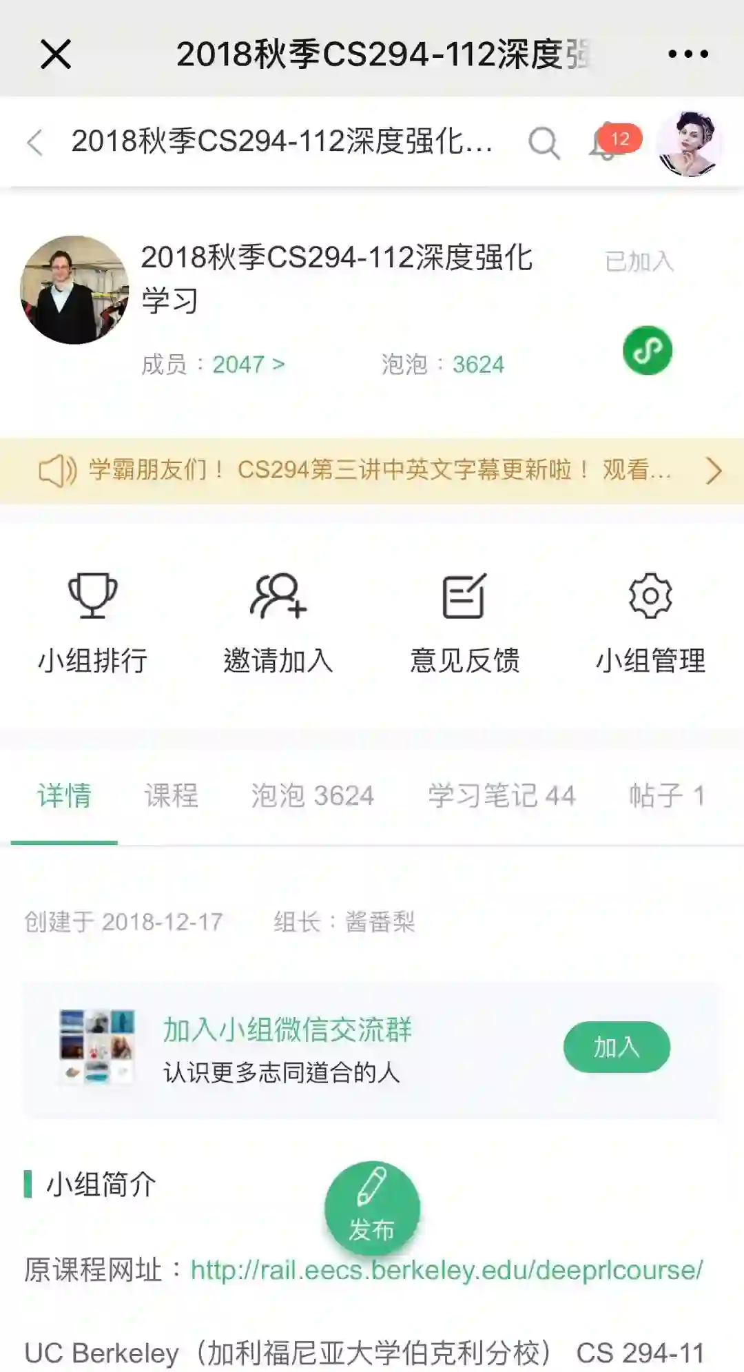点开小组小程序,加入2018秋季CS294-112深度强化学习小组