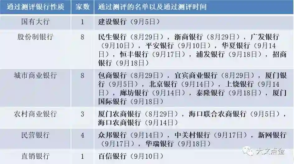 首批通过测评的银行包括25家银行,有以建设银行为代表的国有大型银行,民生银行、广发银行为代表的全国性股份制商业银行,以北京银行、厦门银行为代表的城市商业银行,以及以海口联合农商银行、厦门农商银行为代表的农村商业银行,农村信用合作社、村镇银行等则无一家入围。