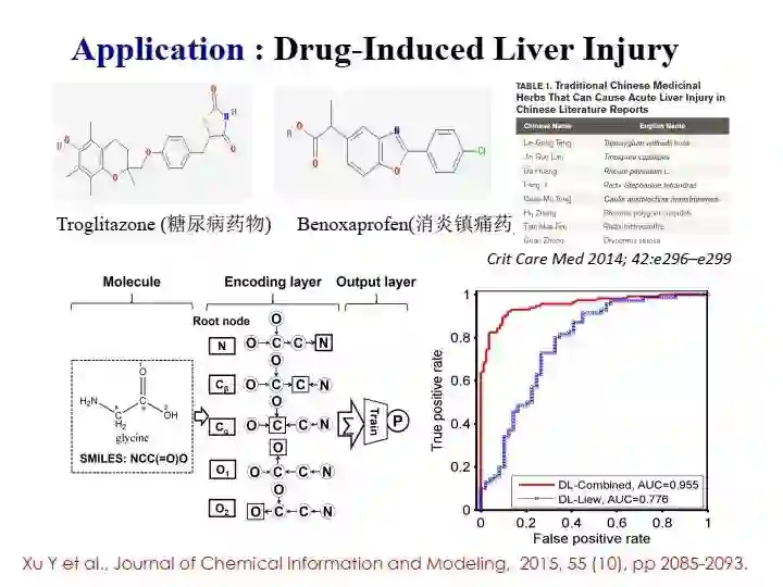 回到药物研发,传统的基于实验的高通量筛选化合物,效率比较低而且风险很大。引入人工智能的目的就是在于提高药物分子设计的效率和成功率、提前预知错误的药物分子或合成路线,及早止损。目前,人工智能主要应用在药物发现阶段,其他的阶段也有些应用。但是,回顾以往的研究,还没有完全证实人工智能技术能在特定成功的新药研发中发挥了绝对作用。下面介绍我们的一些基础性工作。
