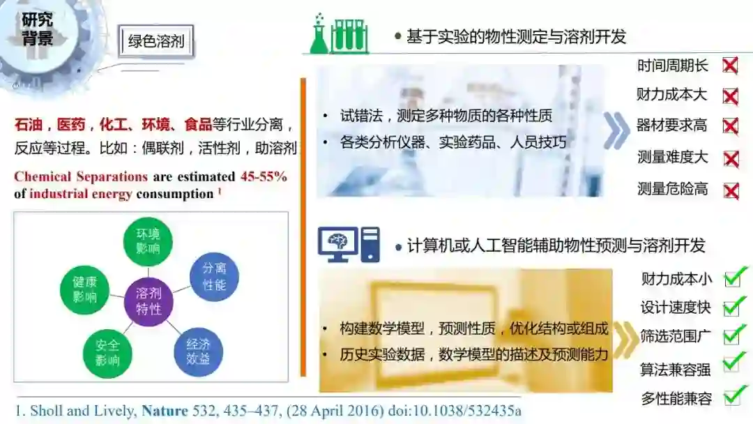 今天和大家分享我们团队最近基于人工智能技术对考虑环境健康安全潜在影响等多方面性质的溶剂开发的最新研究进展。我们的研究方向和李成涛老师相反,他做的是逆向过程,我们做的是正向过程。我从研究背景、研究思路和方法、研究案例以及结论和展望这四个方面展开介绍。