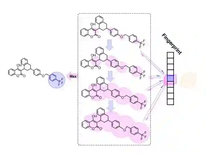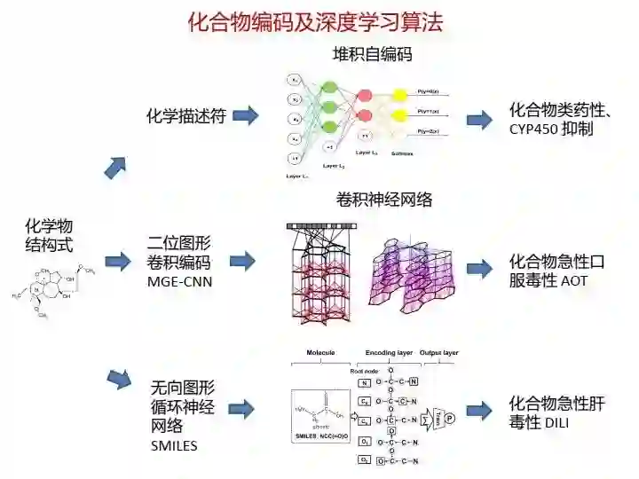 在基于人工智能的药物研发中,药物化合物的分子结构编码是必须解决的问题,一般包含三种方法:一是采用大量的化学描述符(descriptor),每个描述符描述分子的各种局部特征或有限的化学信息,加以组合形成矢量便可以提供化合物较为完善的信息;二是采用类似图卷积的思想,将不同半径范围内的分子子结构特征提取出来,形成分子指纹,例如类似于ECFP4环形分子指纹;三是采用自然语言处理技术,直接处理表示分子结构的线性字符串。