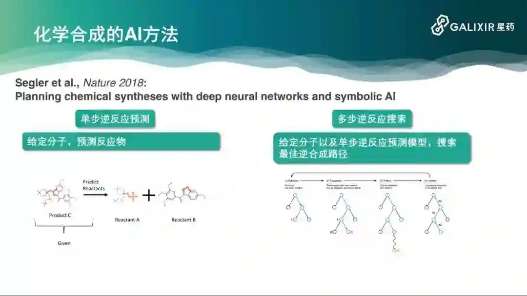 此外,还有一些方法的第一个模块是基于序列预测的。一个化学分子在计算机里可以表示成一个字符串。要从一个化学分子预测它的前体,这本身就是一个字符串到字符串的映射,可以用自然语言处理的方法解决。