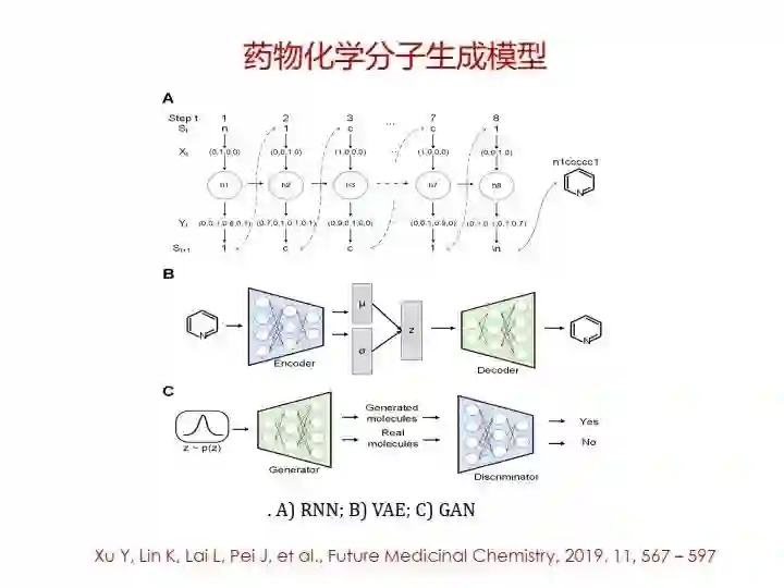 由于分子结构可以看成无向图,所以利用图神经网络来学习,但是也要解决一些其中关键的问题。在实现分子结构的编码及相关的性质/活性预测后,还需回答如何生成目标分子结构的问题。这里讲一下,现在非常热门的生成模型,也可以用在药物分子生成上,可以通过循环神经网络(Seq2Seq)来实现,也可以通过变分自编码器(VAE)或者对抗神经网络(GAN)来实现。