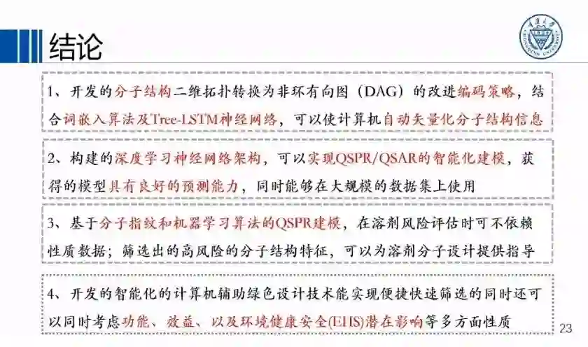 第一,开发了分子结构的改进编码策略,结合词嵌入算法及树形长短记忆神经网络,可以使计算机自动向量化分子结构信息。第二,通过构建的深度学习架构,实现构效关系的智能建模,获得模型的较好预测能力。第三,基于分子指纹和机器学习算法的构效关系建模,可以在评估溶剂的时候不依赖性质数据,筛选出对于健康、对于安全相对应的高风险的分子结构特征。第四,我们开发的技术可以同时考虑功能、经济效益和环境健康安全各方面影响的性质。