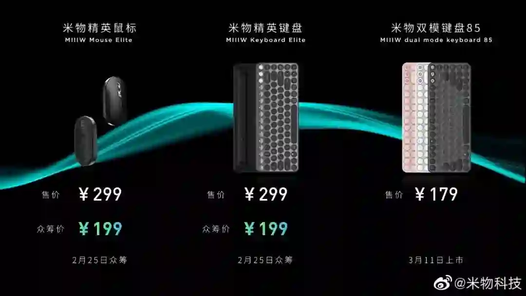36氪获悉,小米生态链公司米物科技今日推出“精英系列”产品,包括米物精英鼠标(支持双击变形、无线双模)、米物精英键盘(支持语音功能、软件设置),两款产品售价均为299元,众筹价均为199元,将于2月25日在小米有品众筹上架。米物科技创始人兼CEO陈臻昊表示,米物精英键盘在之后的软件迭代中将支持IoT功能,比如支持一键关灯等功能。