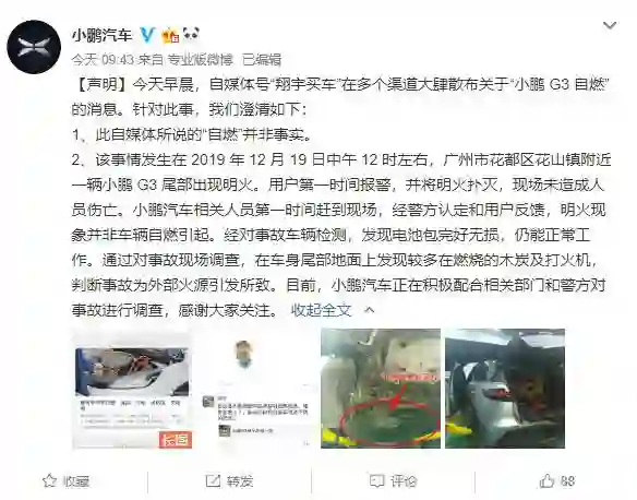 小鹏汽车回应“G3自燃”事件:明火现象并非车辆自燃引起