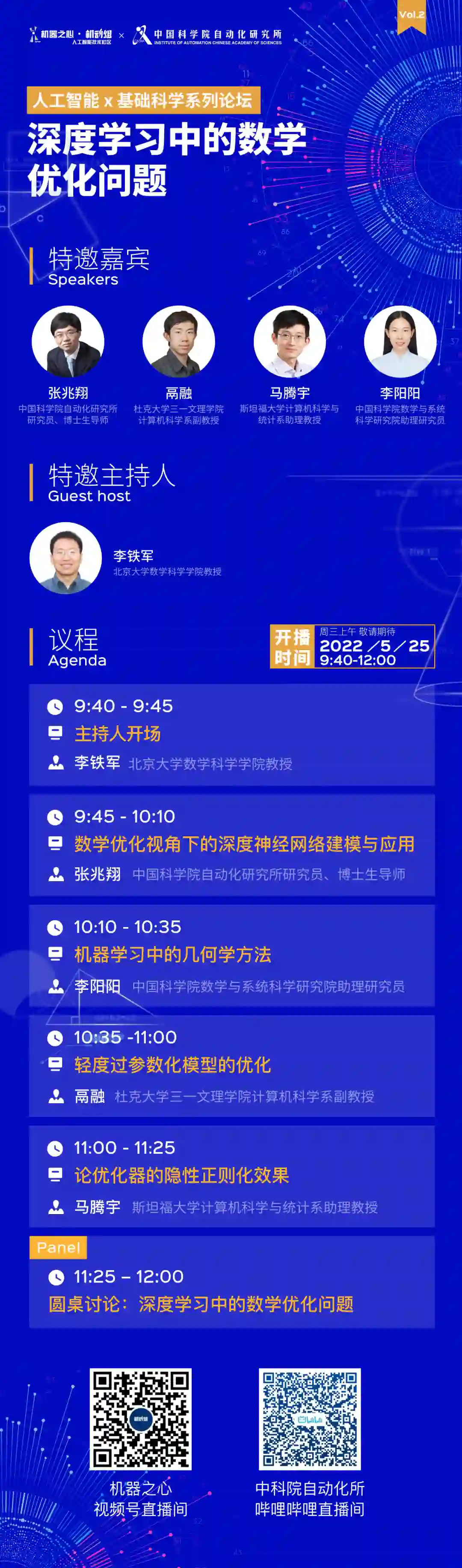 本次线上论坛以「深度学习中的数学优化问题」为主题,特邀北京大学数学科学学院教授李铁军主持,多位领域专家共同分享交流,日程如下: