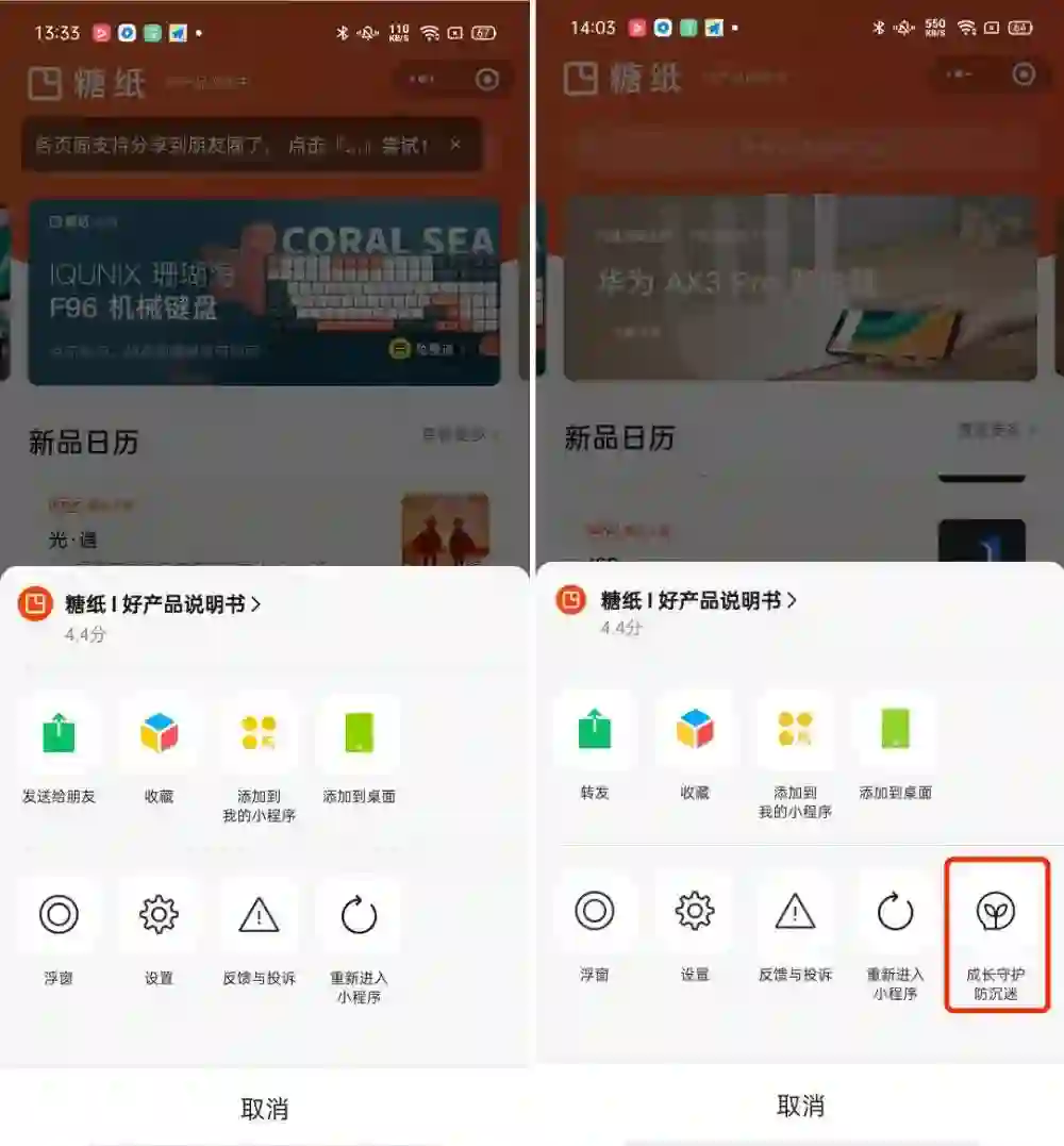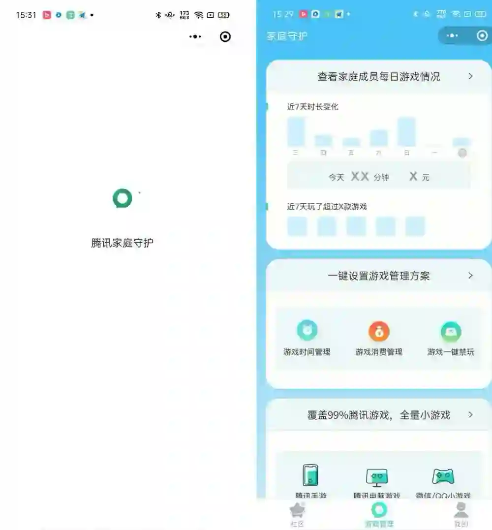 不管是工具类小程序还是娱乐类小程序,不管是电商小程序还是资讯小程序,点击「...」即可看到新增的「防沉迷」按钮,点击后则跳转「腾讯家庭守护」小程序。