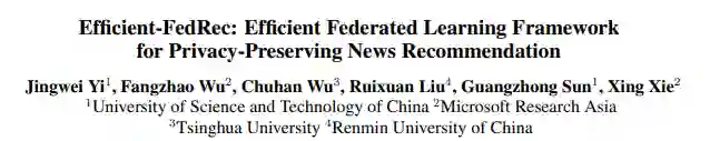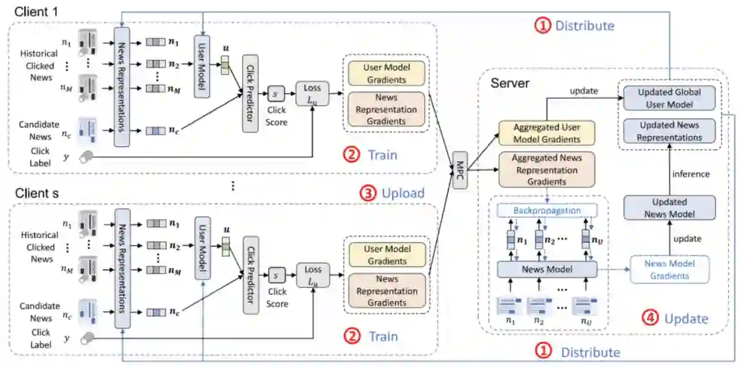 如今,隐私保护对于 AI 系统变得日益重要。由于推荐系统(如新闻推荐)需要使用大量用户的行为数据进行模型训练和推理,因此满足用户数据隐私保护的需求也十分迫切。联邦学习是一种可以实现隐私保护的模型训练框架,能够在用户数据不离开本地的前提下,联合大量用户进行协同模型训练。