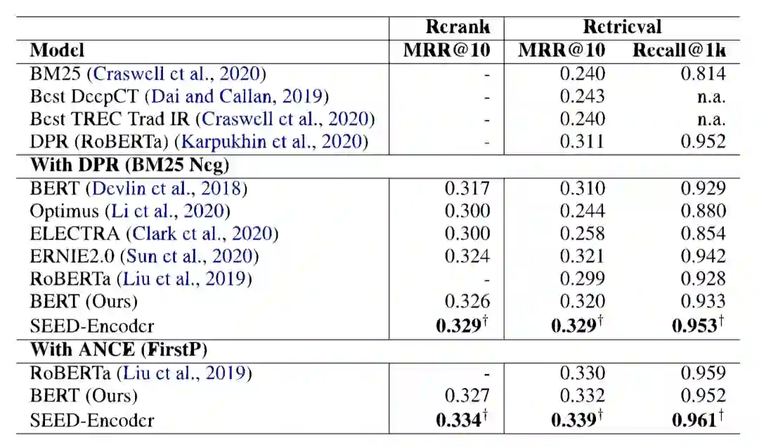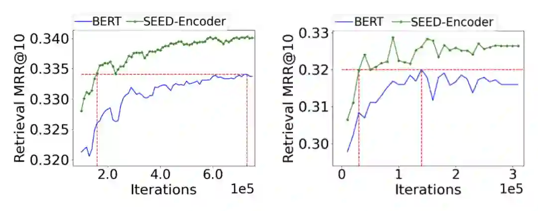 大量实验表明,相比于其他预训练语言模型,SEED-Encoder 的效果有显著的提升;同时也减少了在下游任务上微调所需要的训练轮次,证明了本文所提出方法的有效性。