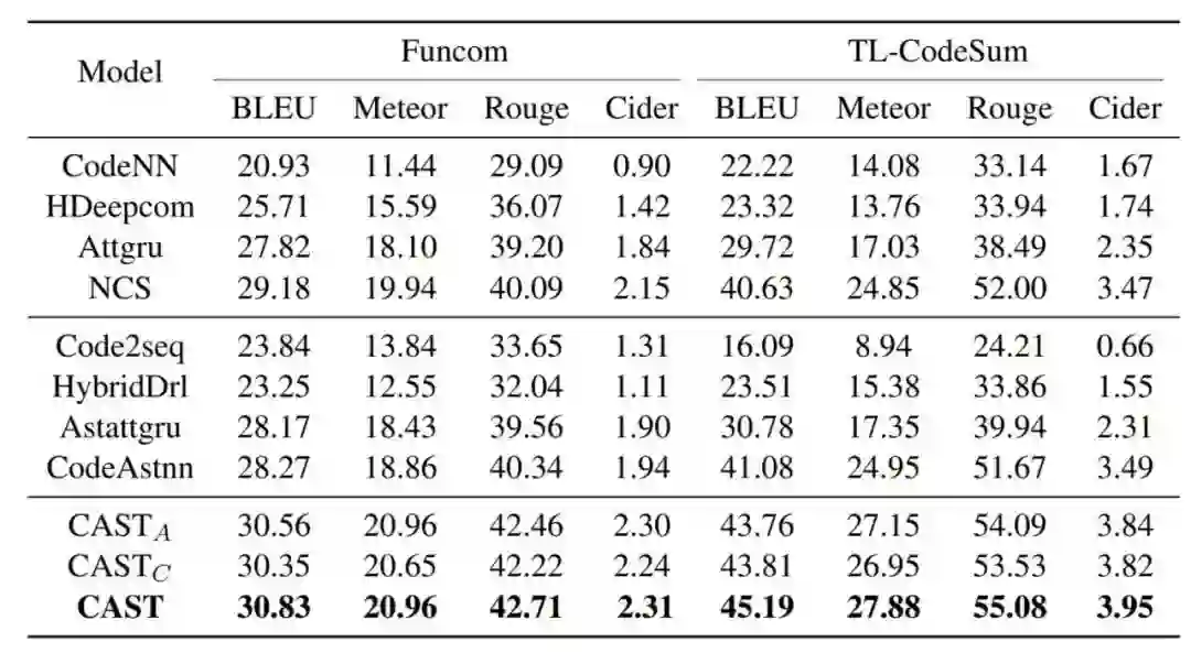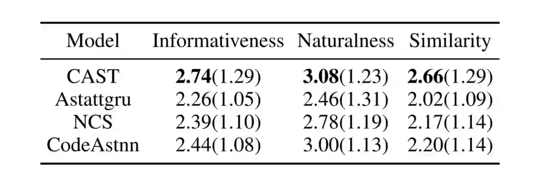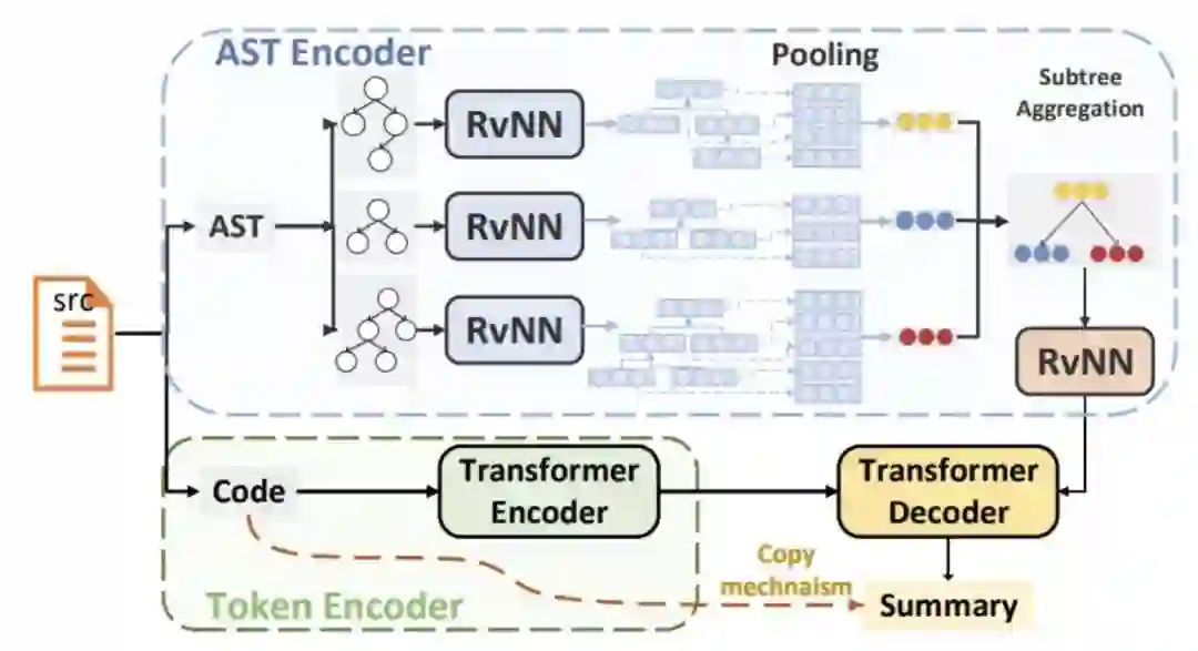 CAST 模型选择了常用的序列到序列的架构,主要包含三个模块:AST 的编码器、代码编码器和摘要解码器。AST 的编码器用来建模代码的语义和结构信息;代码编码器用来建模变量名层面的词汇和语义信息;解码器则结合两个编码器得到的代码表征以及复制机制来生成代码摘要。