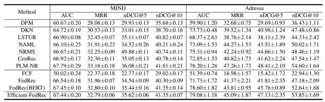 研究员们基于 MIND 和 Adressa 数据集进行了实验。表4中的结果显示,Efficient-FedRec 能够取得与依赖中心化数据存储的新闻推荐方法相似的推荐性能。