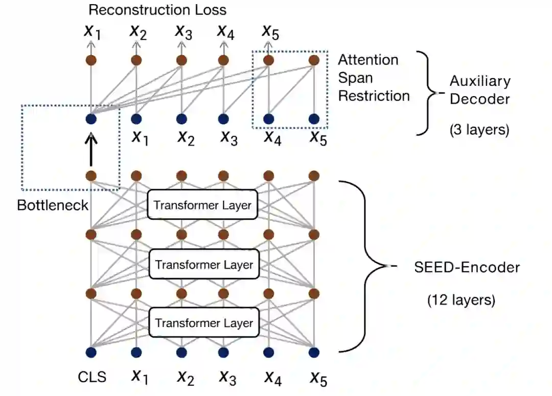 因此本文提出限制解码器的参数以及注意力可见范围,构造弱解码器来解决这个问题。在预训练过程中,本文的训练目标除了 MLM loss 之外还有基于编码器生成的文本表示的弱解码器重构损失。由于弱编码器参数量较少,不会在预训练过程中增加过多开销,同时在下游任务中只需要保留编码器,因此在下游任务上微调的开销与其他预训练语言模型一致,如 BERT。