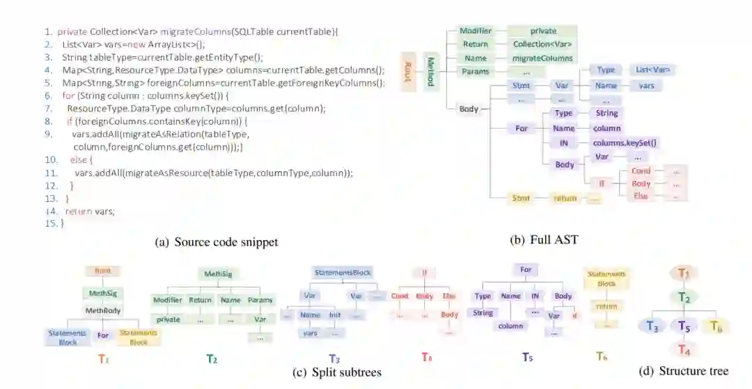 图1:代码及其抽象语法树(AST),切分的子树以及结构树的示意图