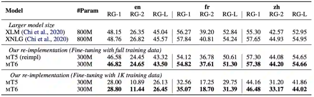 如表7所示,对于 Gigaword 多语言文本摘要任务,mT6 在3个语言上超越了 mT5,并且在低资源的场景下展现了更好的效果。