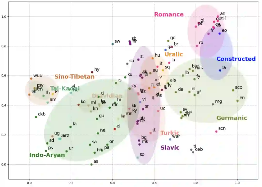 本文另一个重要的贡献是探索了预训练语言模型得到的语言嵌入表示分布与语言学理论的关系,包括 Language Family, Sprachbund 和语言语法。
