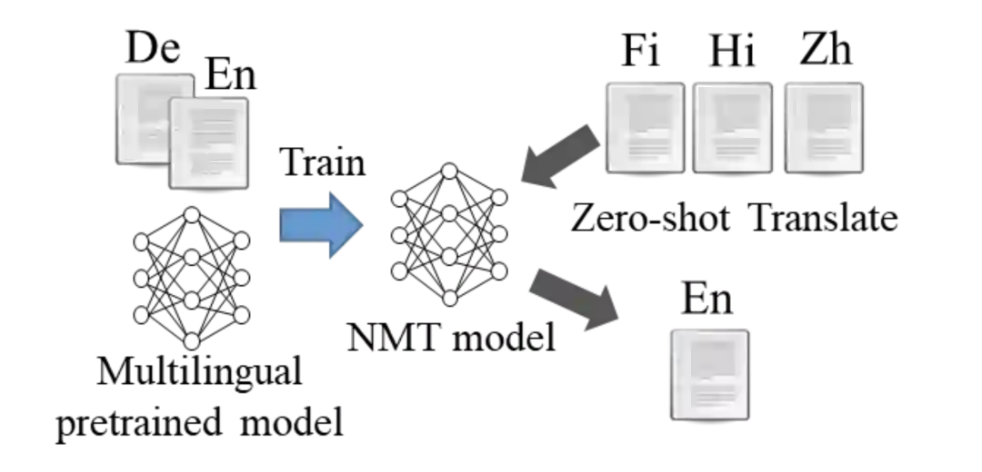 图中 NMT 模型只需要一个训练好的 MPE 和英德双语语料,训练后便可将100种源语言翻译到英语,而无需利用Fi, Hi, Zh等语言的单语或双语信息。