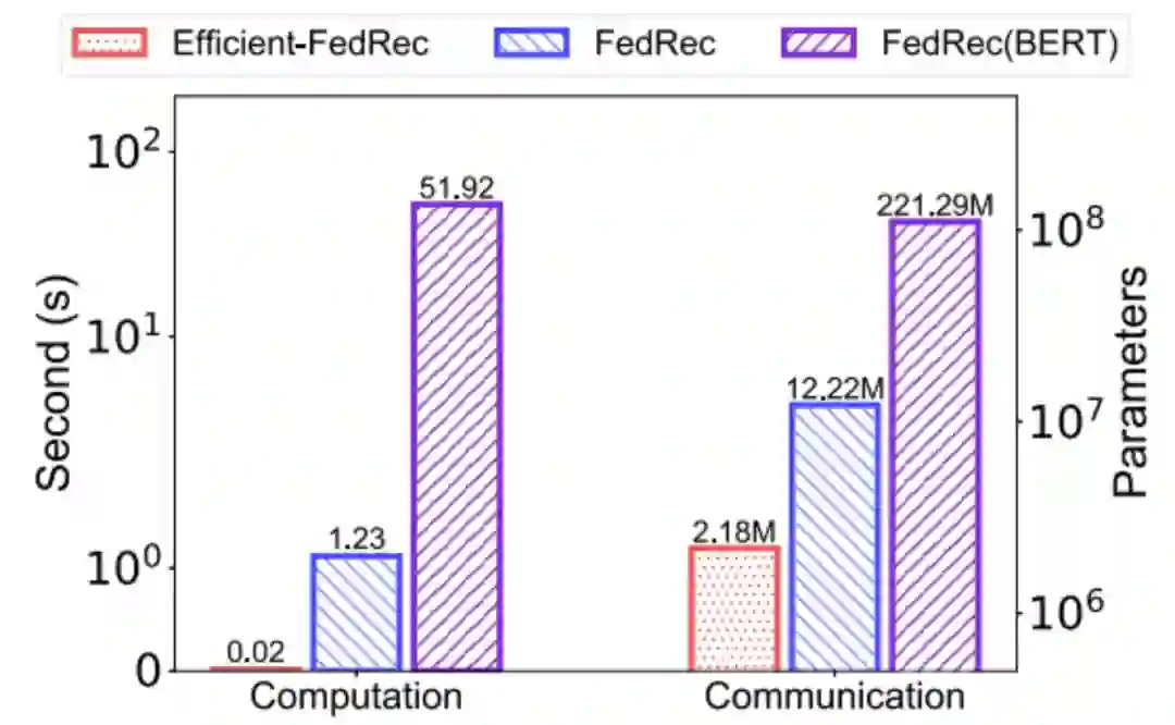 图7进一步比较了 Efficient-FedRec 和其他隐私保护新闻推荐方法的计算和通讯开销。实验结果表明 Efficient-FedRec 可以有效地减小用户端的计算和通讯负担。