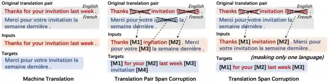 在本篇论文中,微软亚洲研究院的研究员们提出 mT6,即利用翻译句对的多语言预训练文本到文本 Transformer。研究员们提出了三种文本到文本的跨语言预训练任务:机器翻译(Machine Translation, MT)、翻译对完形填空(Translation Pair Span Corruption, TPSC)、翻译完型填空(Translation Span Corruption, TSC)。不同于传统的完型填空任务,在 TPSC 和 TSC 任务中,模型学习会根据双语上下文进行完形填空,以此鼓励模型学习通用跨语言文本表示。