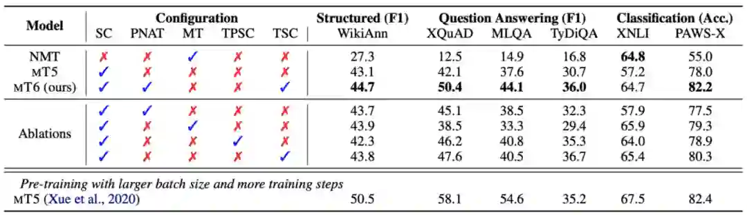 mT6 在 XTREME 多语言理解评价基准的6项任务上均超越 mT5,并且联合使用 SC+TSC 和部分非自回归解码得到了最好的效果,如表6所示。