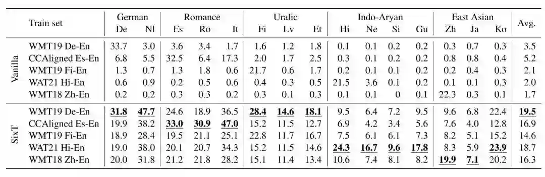如表10所示,一般来说,SixT 在与训练数据集源语言类似的语言上的迁移能力更强。在本文中,研究员们还提出利用 SixT 的零资源跨语言迁移能力实现低资源机器翻译的两个建议:一是更大的训练数据集迁移效果更好;二是尽量在与迁移的目标语言更相近的训练数据上训练。