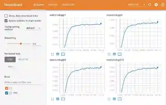 除了编程简单之外,TF-Ranking还集成了TensorFlow生态系统的其他部分。使用TF-Rankign开发的模型可以使用TensorBoard工具集进行可视化评估,如下图所示。