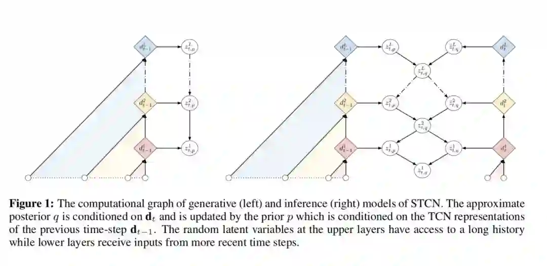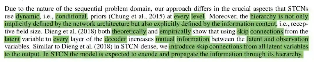 Our contributions can thus be summarized as: 1) We present a modular and scalable approach to augment temporal convolutional network models with effective stochastic latent variables. 2) We empirically show that the STCN-dense design prevents the model from ignoring latent variables in the upper layers (Zhao et al., 2017). 3) We achieve state-of-the-art log-likelihood performance, measured by ELBO, on the IAM-OnDB, Deepwriting, TIMIT and the Blizzard datasets. 4) Finally we show that the quality of the synthetic samples matches the significant quantitative improvements.